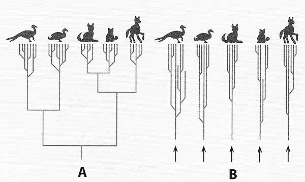 | J&S figuur 1.6 blz 19 (hoenders, eenden, honden, katten. paarden) A evolutie B basistypen |