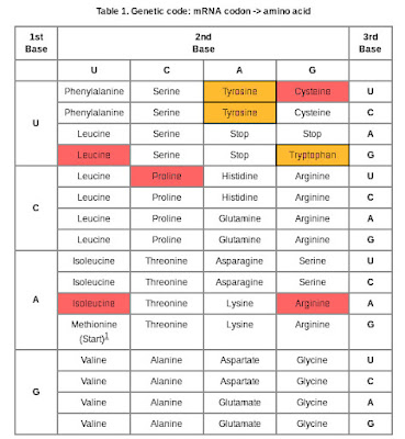 Als je ergens géén mutatie in wilt hebben dan is het wel in je tRNA genen. De noodzaak van het verwijderen van een intron vormt een risico. Het kan fout gaan. En in dit geval is de impact groot. Een mutatie in een enzym dat er voor zorgt dat er een normaal tRNA geproduceerd wordt heeft gevolgen voor de productie van alle eiwitten waarin de betreffende aminozuren in voorkomen. Zo heeft de Volendammer mutatie in TSEN54 fatale gevolgen voor de synthese van eiwitten die de volgende 7 aminozuren bevatten: Proline, Arginine, Leucine, Isoleucine, Tyrosine, Cysteine, Tryptofaan. Als een eiwit veel van deze aminozuren bevat moet de impact dramatisch zijn. Als je die inkleurt in de bekende genetische code tabel dan krijg je: