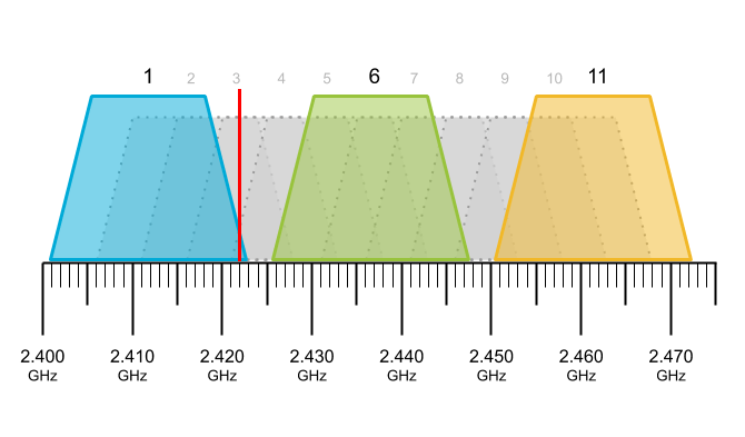 Dit plaatje geeft de aanbevolen kanalen 1, 6 en 11 zoals je die op het internet kunt vinden (de rode streep heb ik toegevoegd). Je kunt vele soortgelijke plaatjes vinden. Dit is een officiële aanbeveling: