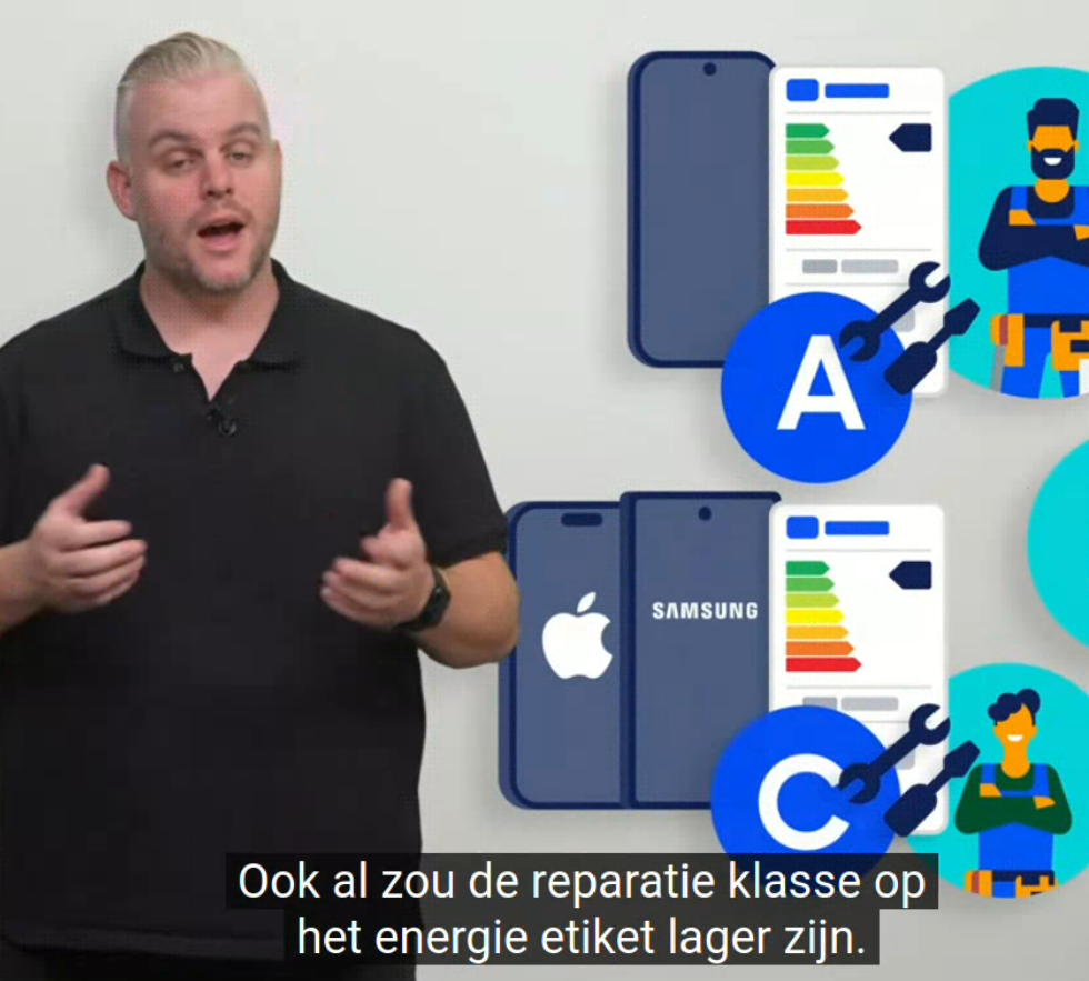 "Op het energie etiket staat ook de repareerbaarheidsklasse. Deze is bijvoorbeeld hoger als een reparateur minder stappen nodig heeft om een onderdeel te vervangen en dit met gangbaar gereedschap kan doen. Dat is natuurlijk niet helemaal hetzelfde als een reparatiewinkel vlakbij jouw huis, die een probleem met je smartphone snel en goedkoop oplost. Daarom kan het zo zijn dat je met een minder bekende smartphone in de hoogste reparatie klasse, minder makkelijk terecht kunt bij een reparateur, dan met de meest verkochte Samsung en Apple telefoons. Ook al zou de reparatieklasse op het energie etiket lager zijn."